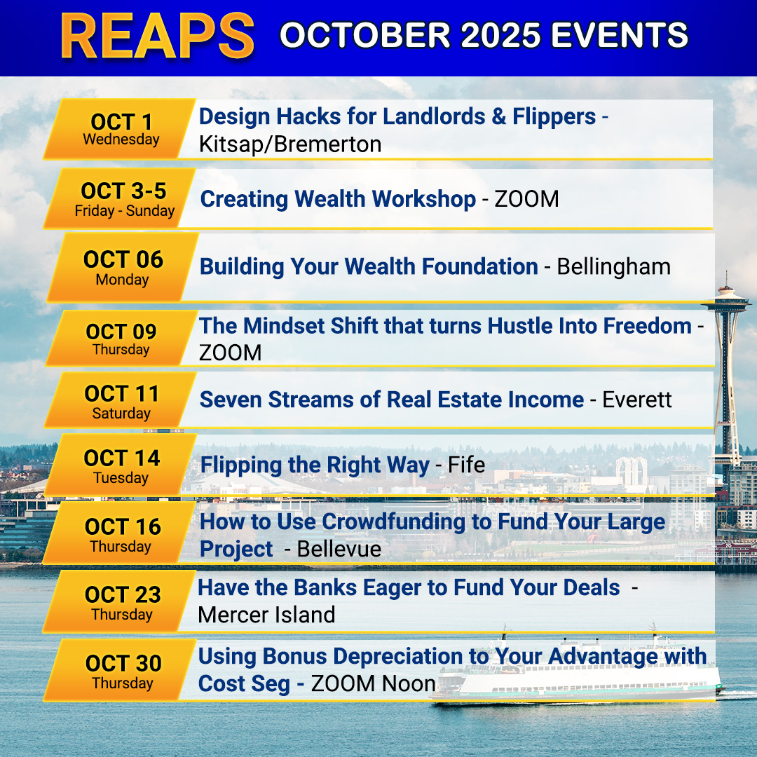 Apartment Market Dynamics with Candice Chevaillier, Oct 14 2020 Learning Title and Escrow with WFG National Title, Oct 12 2020 Local Seattle Flippers Talk on Flipping in the Current Market, Oct 10 2020 Navigating the Current Market & Lease Option Investing with Jim Pellerin, Oct 1 2020 Short Sales with Bill and Dwan Twyford, Sept 24 2020 Seattle Real Estate Investor Networking on Zoom, Sept 14 2020 Apartment Investing- Building 1 to 5 by Gerry Swartz, Sept 9 2020 Buying Off Market thru owning a We Buy Ugly Houses Franchise, August 29 2020 Seattle Real Estate Market Report with Todd Britsch, August 17 2020 FREE SAMPLE MEETING Screening your Tenant like your next Biz Partner by RENT PERFECT, August 5 2020 Tax Savings with 1031s and the Personal Tax Exemption with Dave Foster, August 1 2020 Asset Protection Planning with Carl Zoellner, July 23 2020 FREE SAMPLE MEETING Deal or No Deal- Market Analysis using Pellego's Tools by Gideon Sylvan, July 16 2020 Financial Planning for the Real Estate Investor by Fernando Pohina, July 13 2020 Choosing the Right Property Manager with Alberto Stein Rios, July 9 2020 Lease Options by Mike Sumsky and Doug Owens, July 1 2020 Seattle Area Apartment Investing by REAPS Members, June 10 2020 Apartment Investing with Anthony Chara and REAPS Members, June 4 2020 Credit Optimization and Restoration with Anthony Iacobucci, June 4 2020 Self Storage Real Estate Investing with Scott Meyers, May 28 2020 Seattle Real Estate Investor Deal Analysis with Gideon Sylvan, May 23 2020 RE Brokers who service those that are BOTH Seattle Real Estate Investors and Agents, May 19 2020 Short Term Rentals with Sherry Rui and Sarah Carter, May 11 2020 FREE SAMPLE MEETING Greater Seattle Apartment Market with Dylan Simon, May 6 2020 Landlord Laws Update with Christoper Cutting and Kaitlyn Jackson, April 23, 2020 Property Management by Katherine Swanberg & Tracy Minick, with Mortgage Market update with Shaun Guerrero, April 16, 2020 Wholesaling in Today's Market with Greg Gallagher, Apr 13, 2020 Gerry Swartz shares on Out of State Multifamily Investing, Apr 8, 2020 All in One Loan-Flexible loan to pay down mortgage or utilize equity, Apr 1, 2020 Hard Money lenders give Insight for right Now! Mar 26, 2020 FREE SAMPLE MEETING Private Money Lending with Ryan Gibson, Mar 21, 2020 FREE SAMPLE MEETING Get our EVENT Announcement EMAILS on Seattle Real Estate Investing educational classes by texting REAPS to 22828